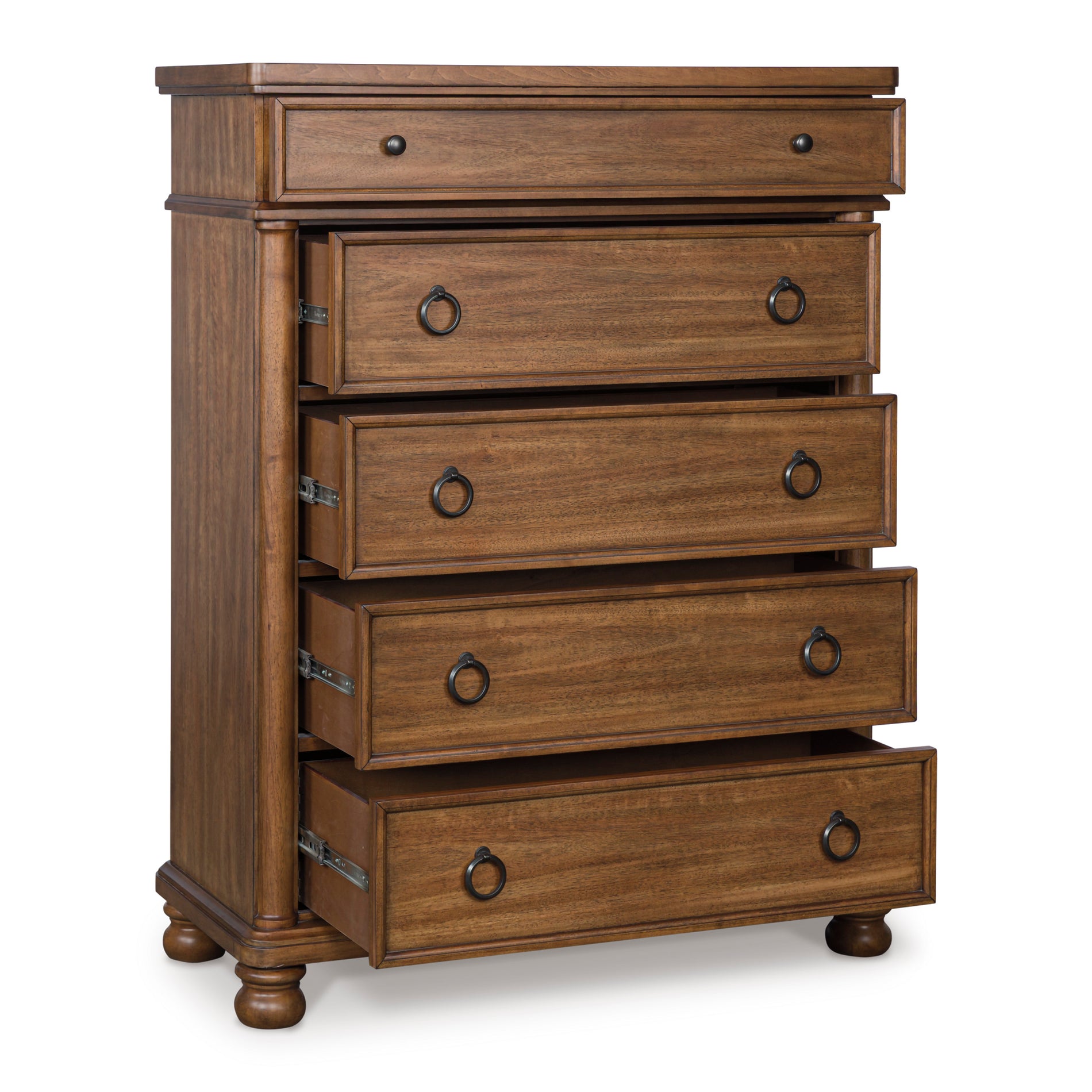 5 smooth-gliding drawers with fully finished interiors, French/English dovetail construction and heavy-duty ball-bearing side glides