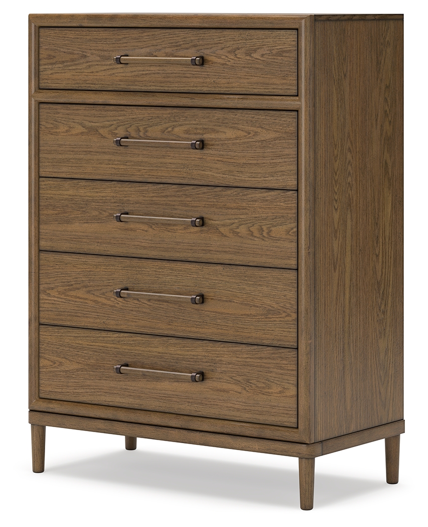 Give your mid-century modern bedroom that finishing touch with the Roanhowe chest of drawers. Spacious drawers with unique wooden drawer pulls enhance the design with stunning style. This chest takes minimalism to the max.