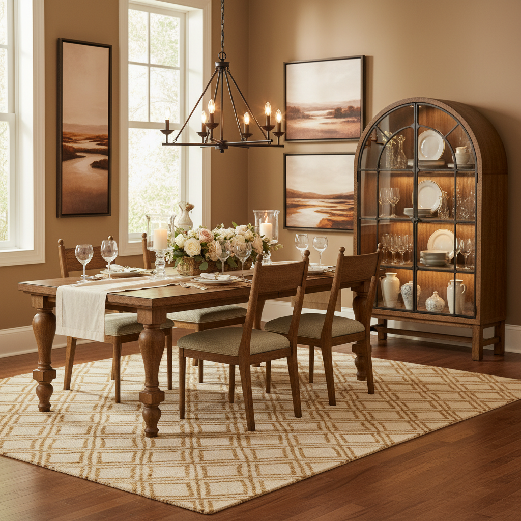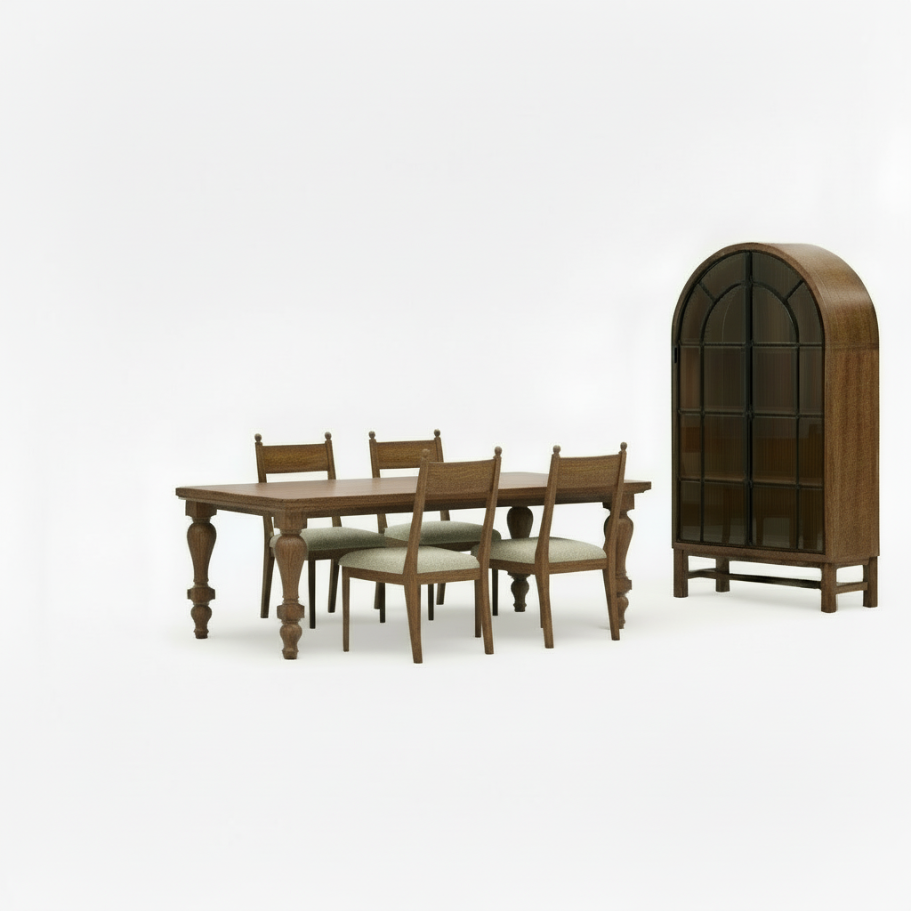 Transform your dining space into an elegant entertainment hub with the Chadworth Dining Set. This sophisticated six-piece collection features a spacious dining table paired with four comfortable chairs, complemented by a stunning display cabinet that showcases your finest dishware and décor. Crafted with attention to detail, the set combines functionality with timeless style, making it perfect for family gatherings and dinner parties. The display cabinet adds a touch of refinement while providing practical storage solutions. Ideal for homes seeking a complete dining solution that balances beauty, comfort, and utility in one cohesive package.