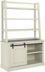 Made with paint grade materials and finished in a chipped white color. Unique casual look features canted and angled elements with farmhouse construction. Barn door hardware completes the look. Desk features angled leg structure, three drawers and an inset faux cement top. Credenza features a faux cement top and sliding barn door with dark gray hardware concealing open shelving. Optional angled shelving hutch. Bar pull hardware has an industrial look with dark gray finish.