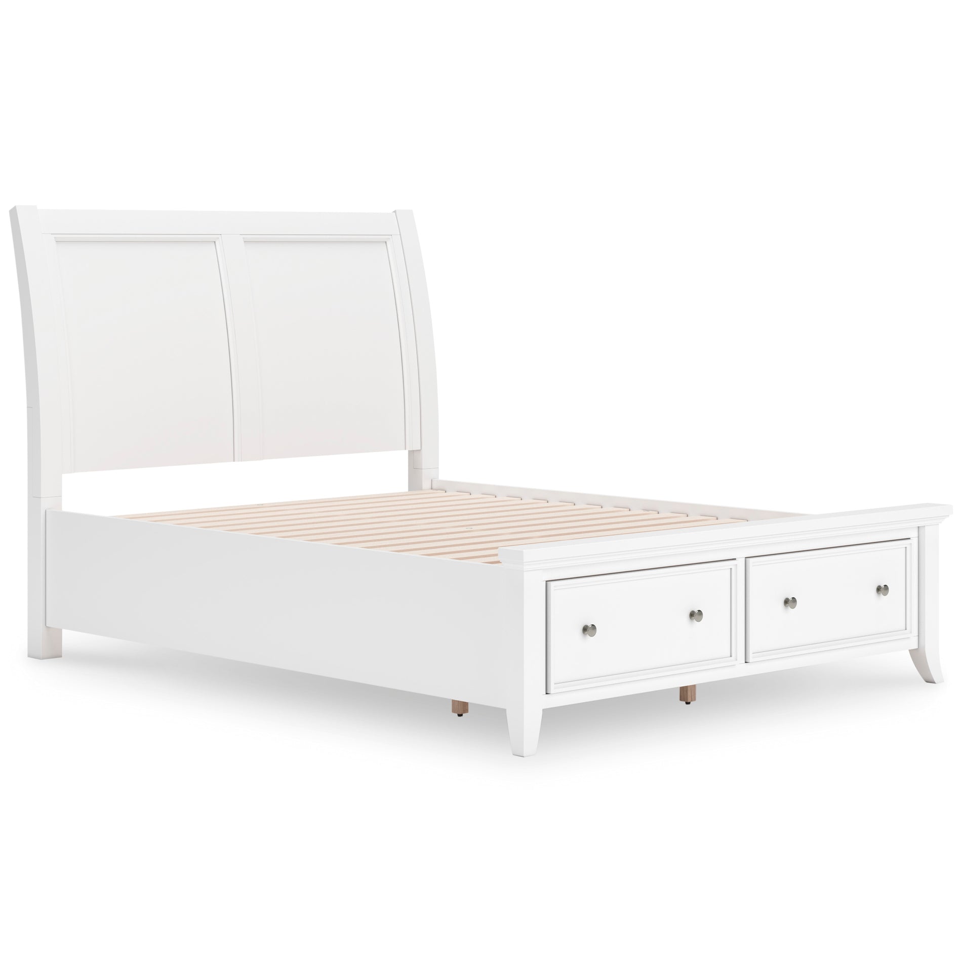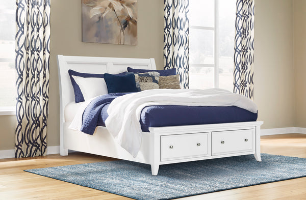 Includes sleigh headboard, panel rails and storage footboard with roll slats